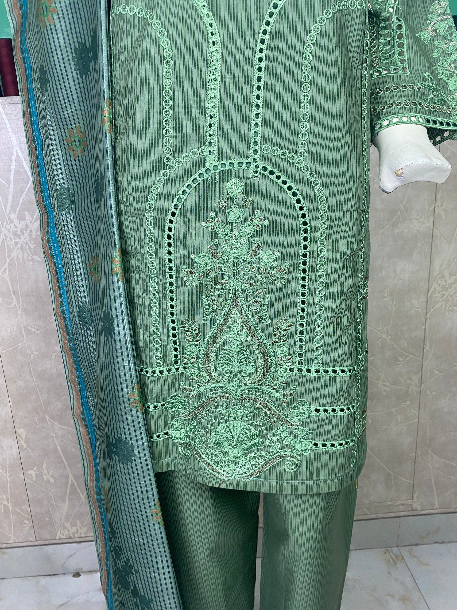 Elegant, breathable, and beautifully detailed — this 3PC embroidered suit is crafted from premium self cotton, offering both comfort and sophistication.