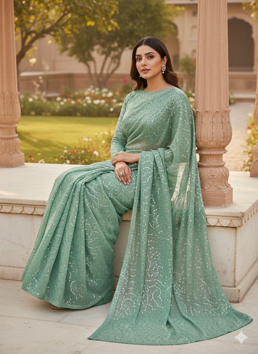 Premium Moonlight Fabric Saree | Aqua Green Glitz with Matching Modest Blouse | Factory Direct Price