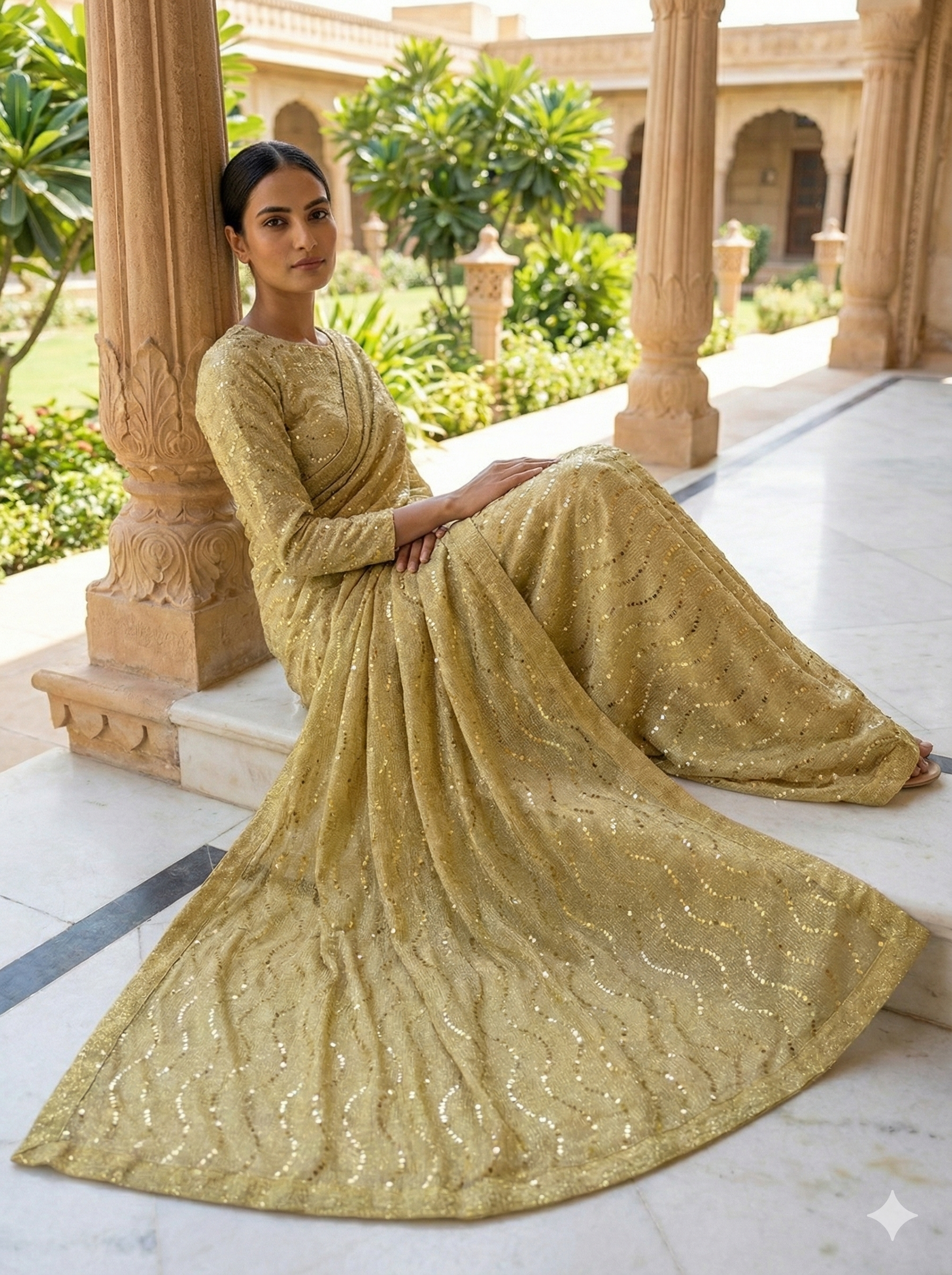 Premium Moonlight Fabric Saree | Golden Glitz with Matching Modest Blouse | Factory Direct Price